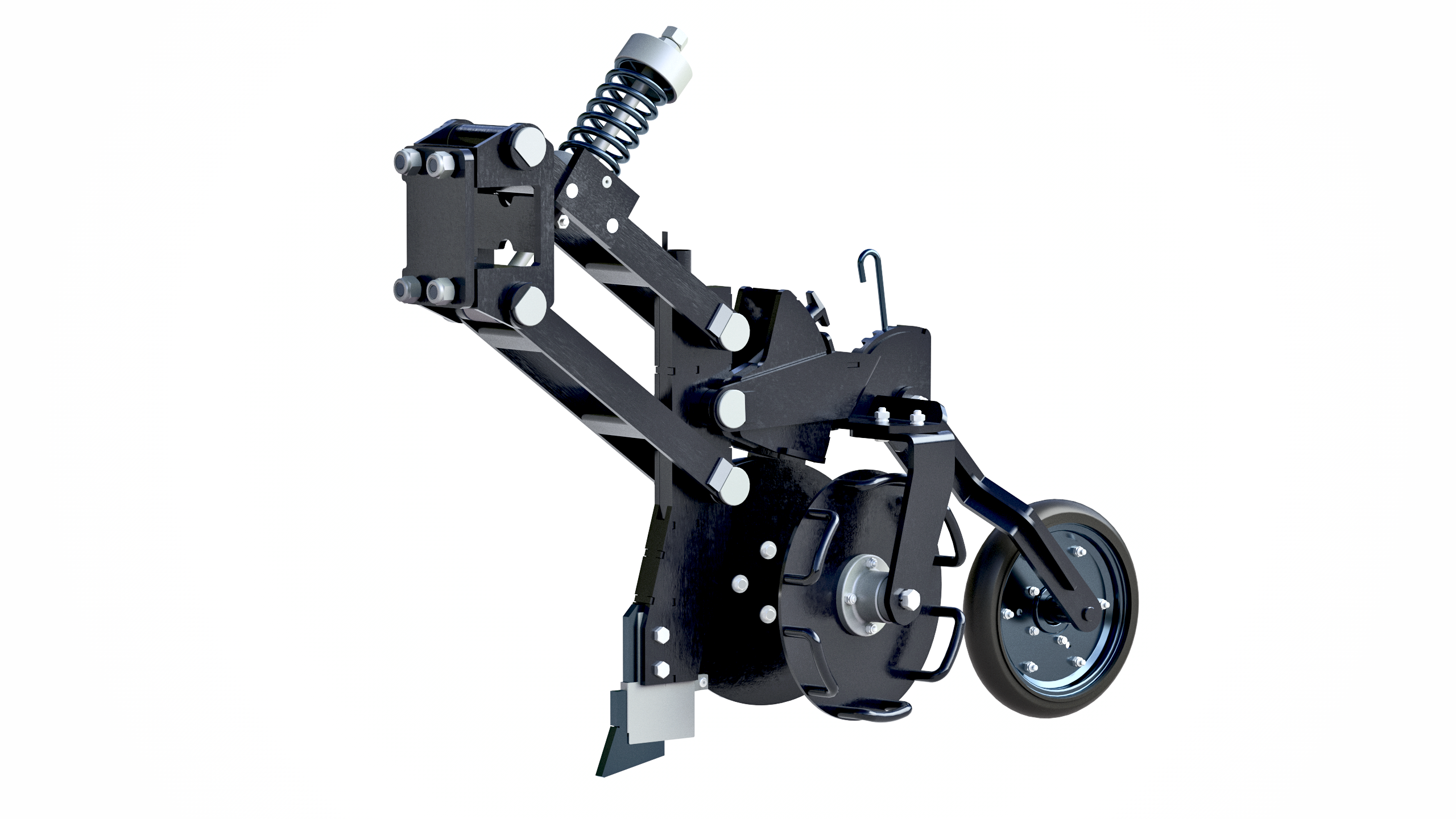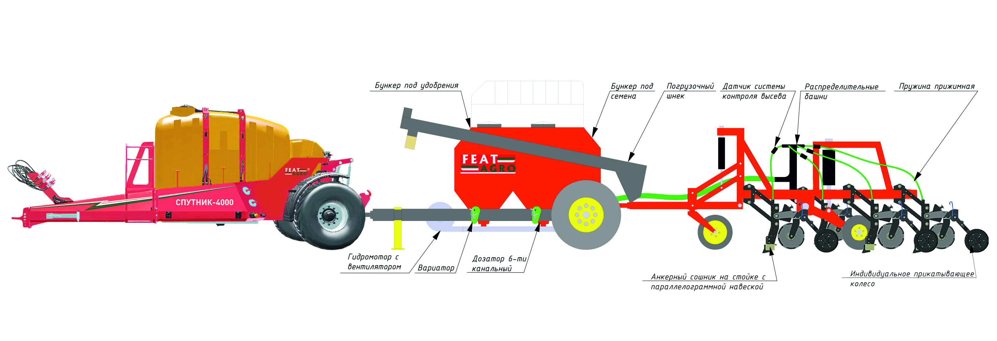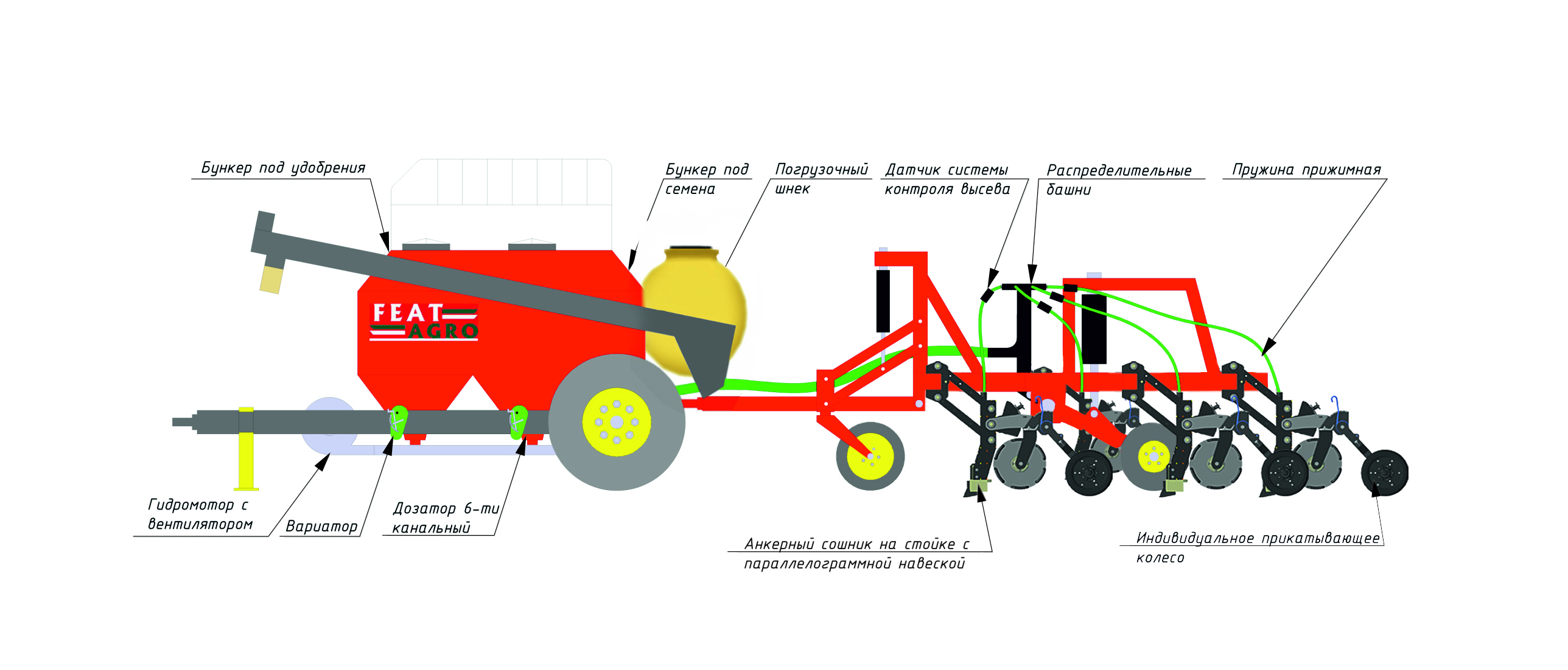 -анкерного сошника на параллелограммной навеске с пружинной регулировкой усилия врезания в почву; -двух опорно-собирающих колес с возможностью регулировки угла атаки; -индивидуального прикатывающего колеса с возможностью регулировки усилия прикатки.